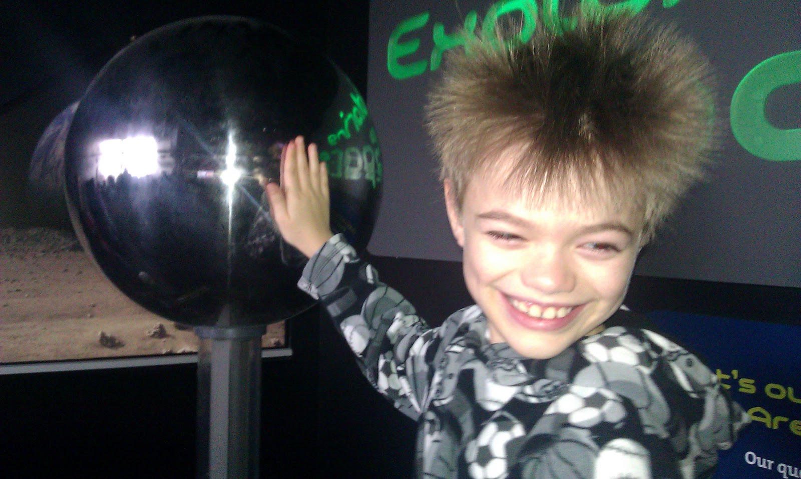 This is me... never mind the hairstyle! You see, the electricity made my hairstyle. I call it the Up-With-the-Hair hairstyle. That is a Van De Graaff generator in the background. It looks like a silver sphere on a stick.